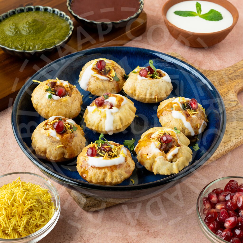 Delightful wheat wafers topped with a delectable blend of potatoes, yogurt, tangy tamarind sauce, and spicy mint sauce enhanced with flavourful spices and garnished with pomegranate, sev, and cilantro.