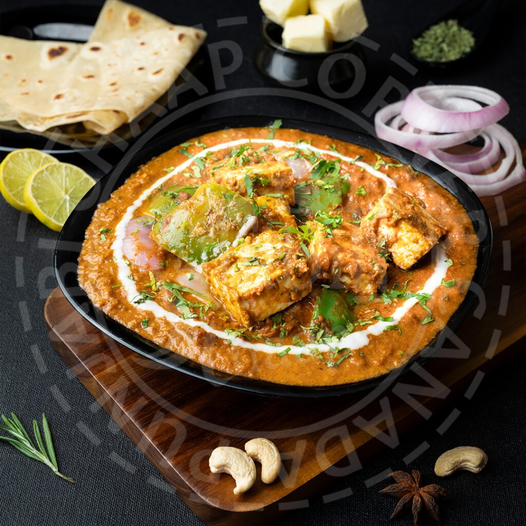 Grilled cubes of paneer tossed with onions and green peppers in a tomato and cashew-based curry to give that rich creamy flavor. Comes with a choice of 2 butter kulchas or rice.