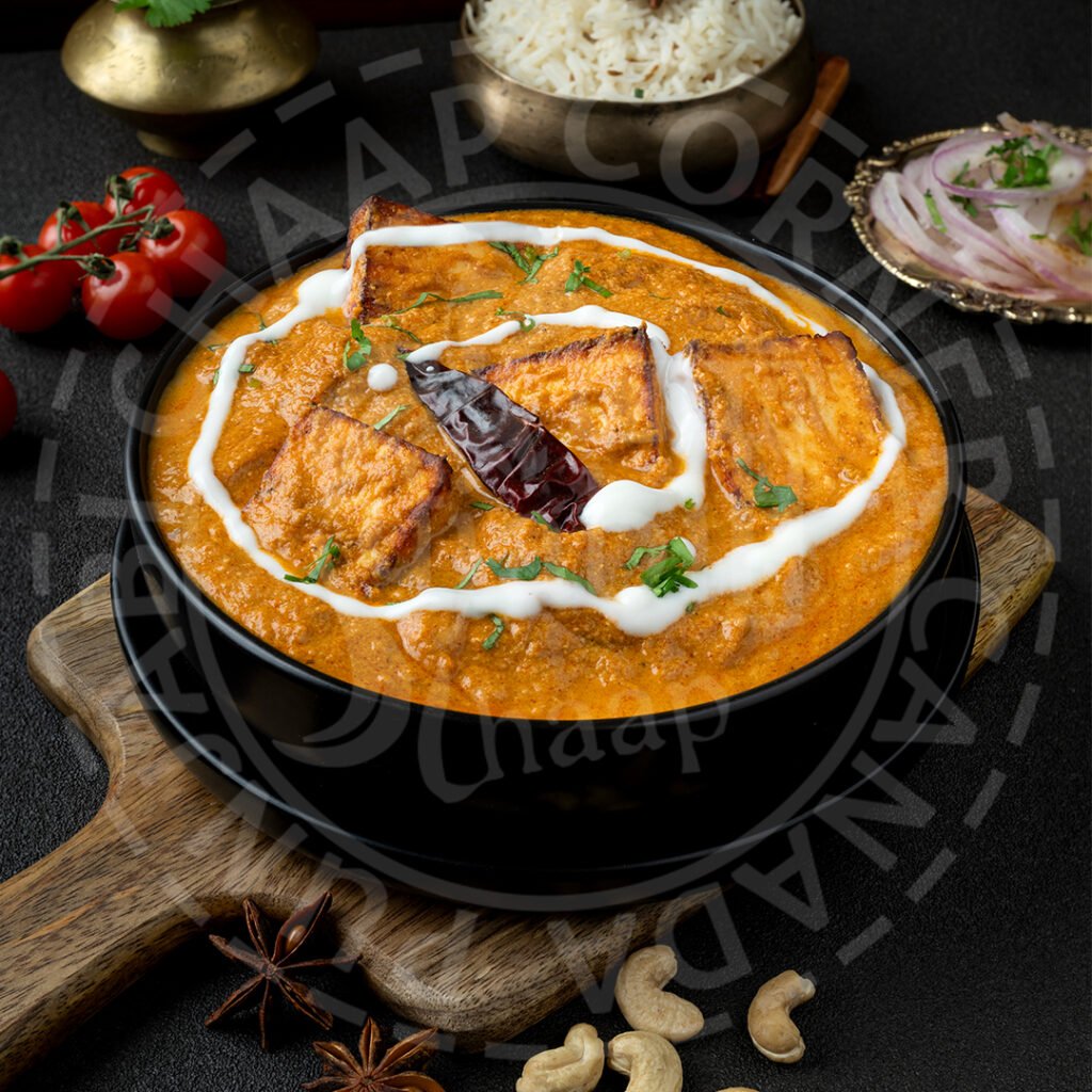 Grilled cubes of paneer simmered in a smooth and silky gravy made from tomatoes, ground cashew, clarified butter and cream along with distinctive spices. Comes with a choice of 2 butter kulchas or rice.