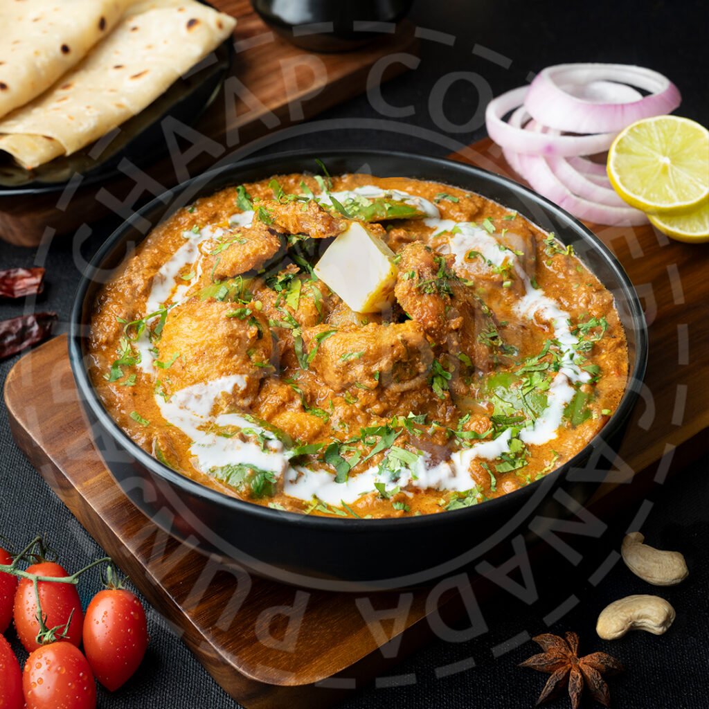 Deliciously grilled cubes of soya chaap tossed with onions and green peppers in a rich and creamy sauce made with tomatoes, cashews, butter and select Indian spices. Comes with a choice of 2 butter kulchas or rice.