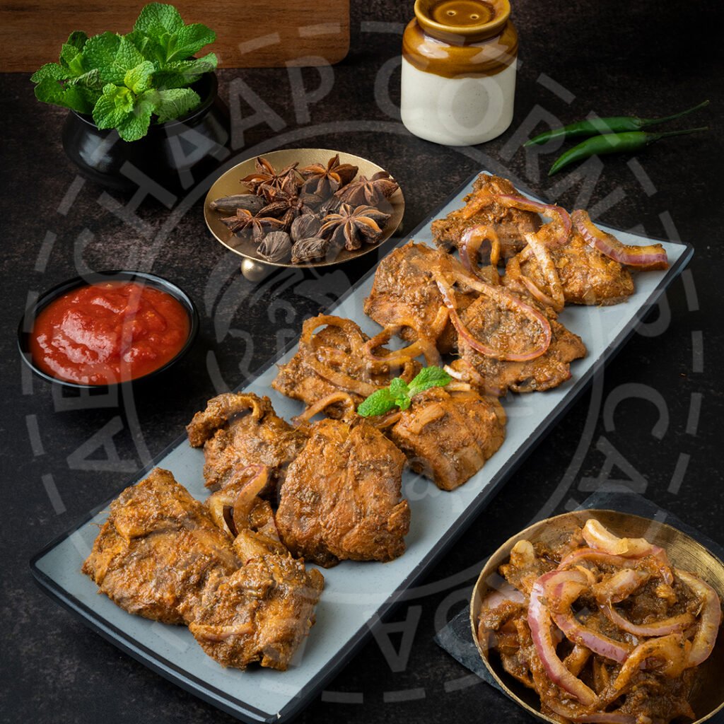 Grilled cubes soya chaap marinated in a minty flavorsome sauce with selected Indian spices and tossed with onions. Served with mint sauce.