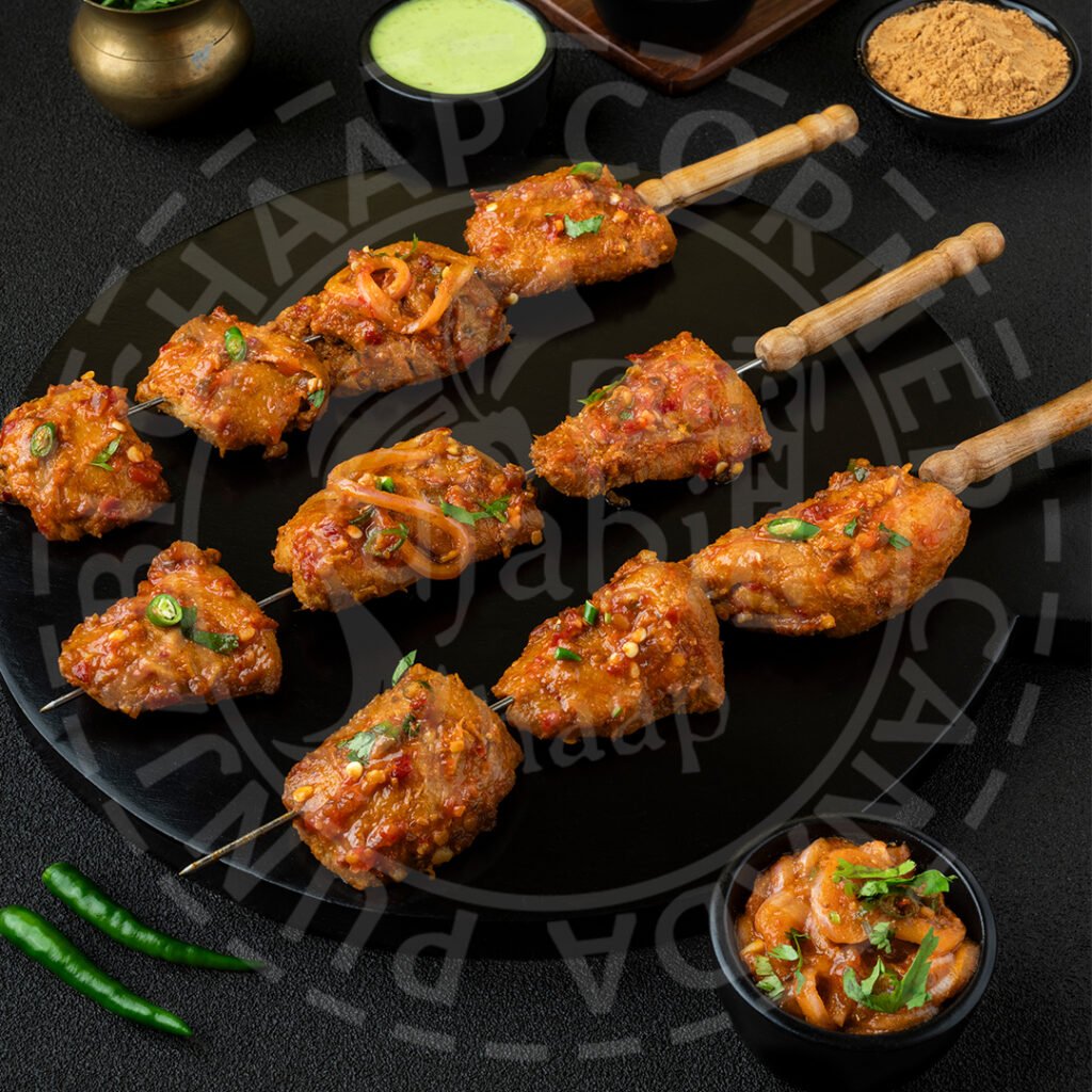 Grilled cubes of soya chaap marinated in a spicy peri peri sauce and tossed with green chilies, onions, and cilantro. Served with mint sauce.