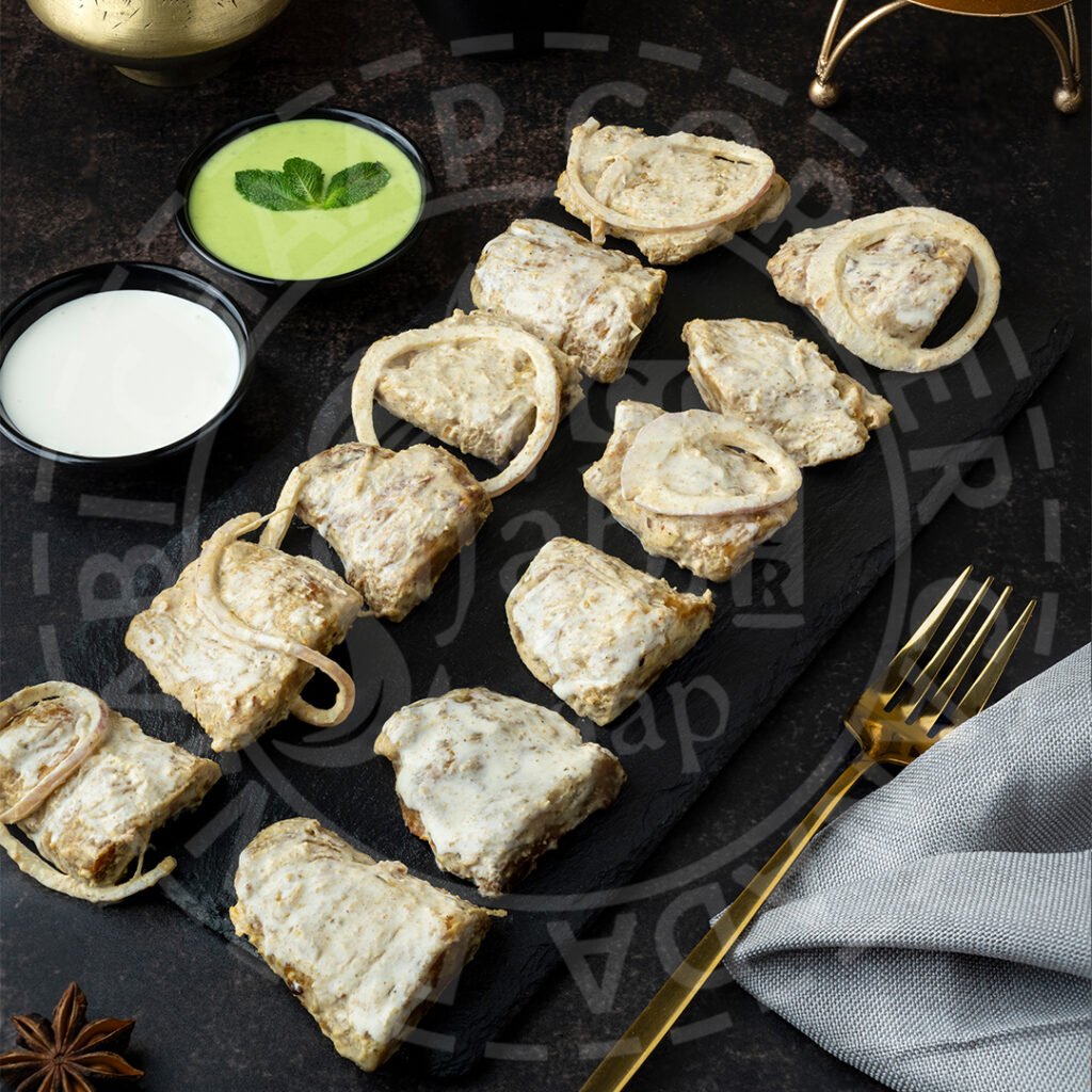 Grilled cubes of soya chaap marinated in a rich creamy masala tossed with onions and garnished with a generous dollop of butter. Served with mint sauce.