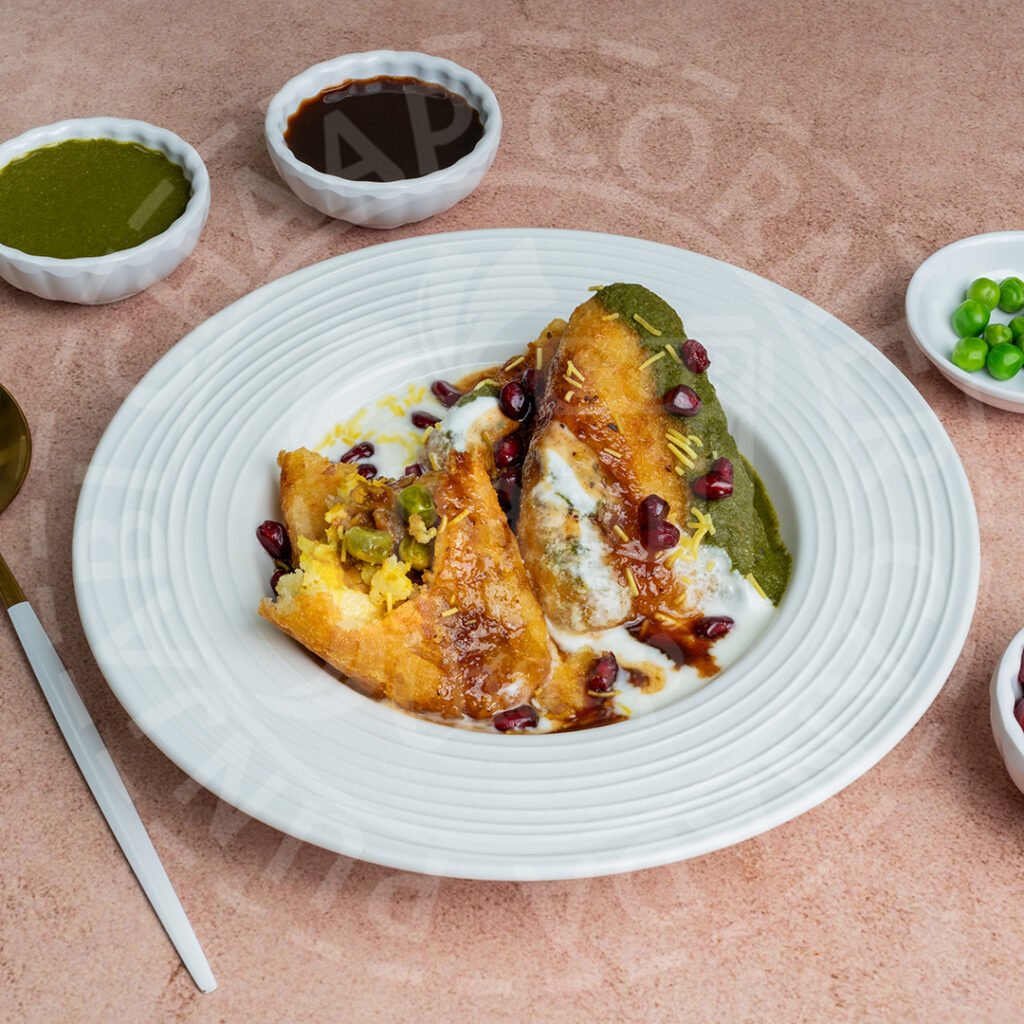 Aloo TikkiDeep fried crispy potato and peas tikki topped with chana masala, yogurt, onion, and tangy chutney.