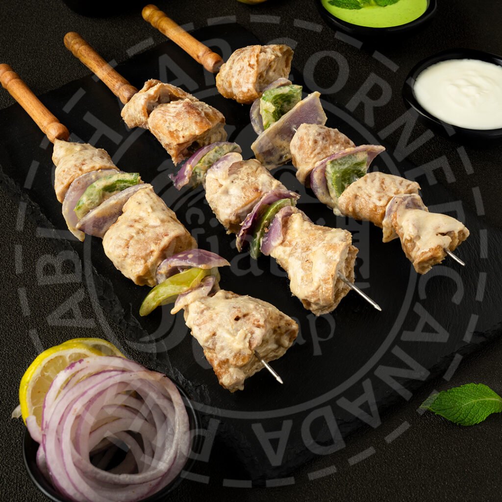 Grilled cubes of soya chaap marinated in a rich creamy sauce grilled to perfection to provide the mild yet Mughal flavors. Served with mint sauce.