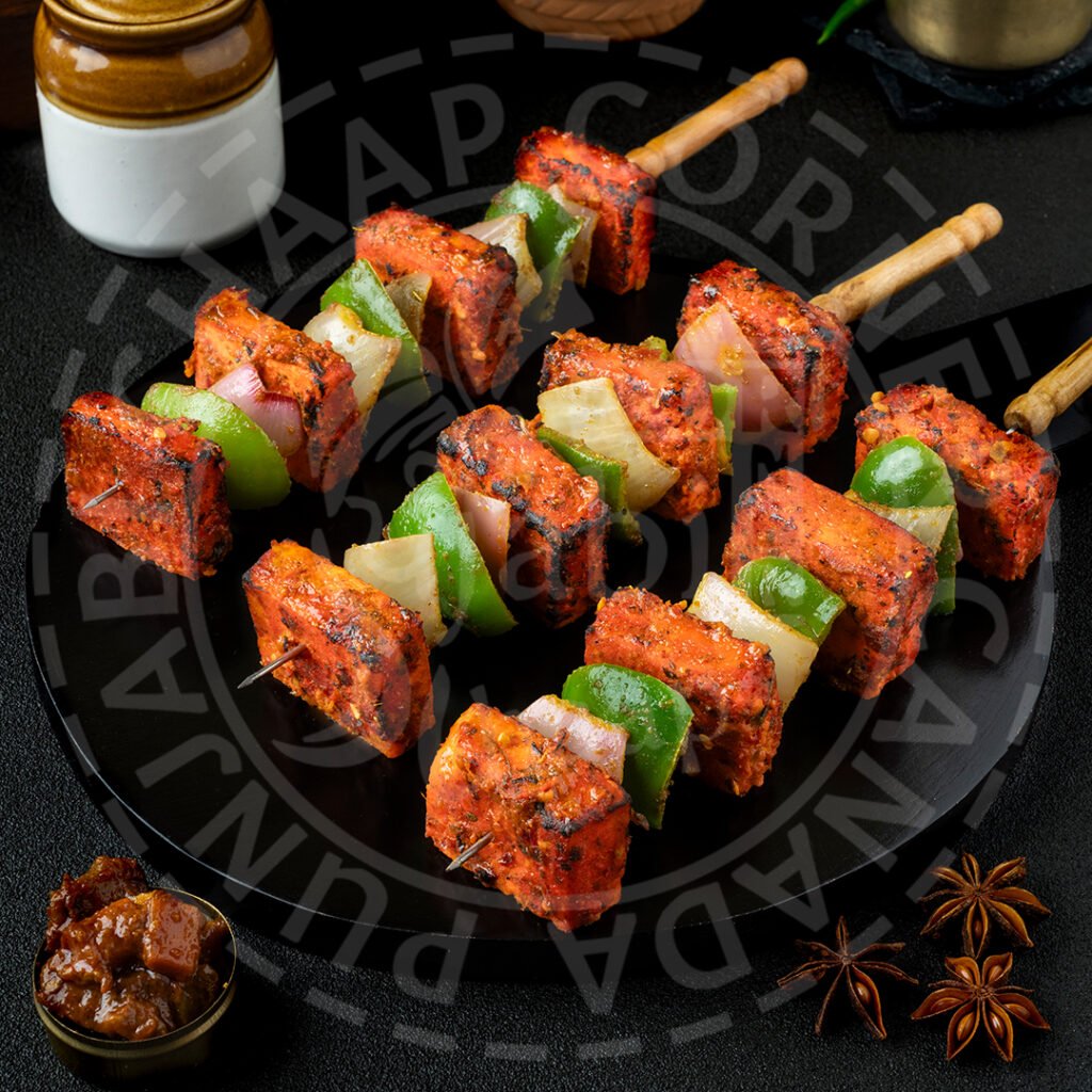 Achari Paneer TikkaGrilled cubes of paneer flavored with a marination of pickled tikka sauce and seasonings. Served with mint sauce.