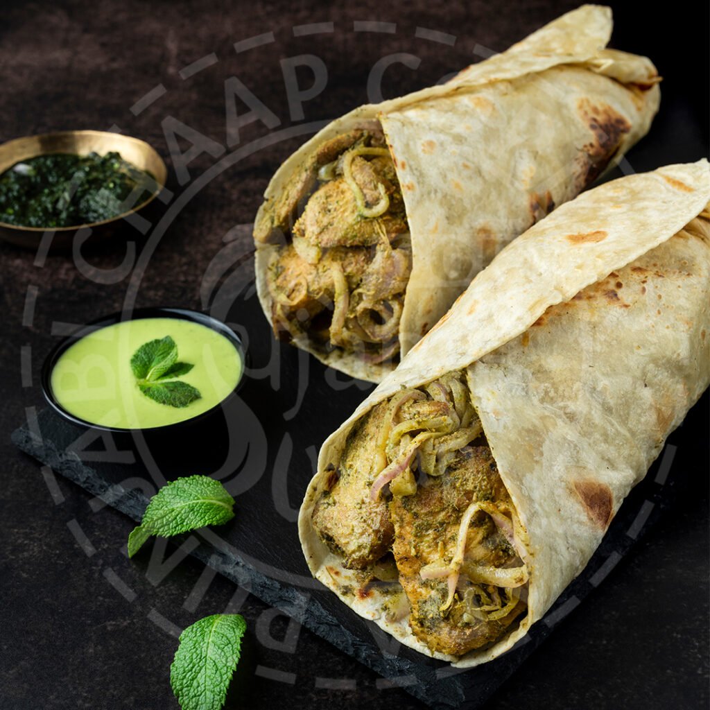 Tortilla filled with marinated and grilled cubes of soya chaap, tossed with onions in haryali sauce. Served with mint sauce.