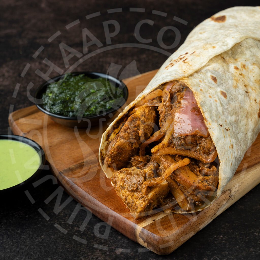 Tortilla filled with marinated and grilled cubes of soya chaap, tossed with onions in unique tangy sauce. Served with mint sauce.