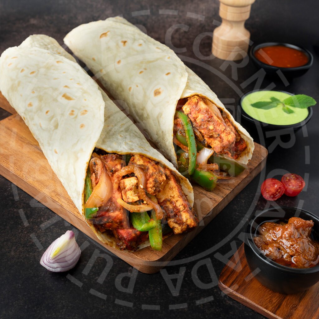 Tortilla filled with marinated and grilled cubes of paneer and veggies tossed in pickled spices. Served with mint sauce.